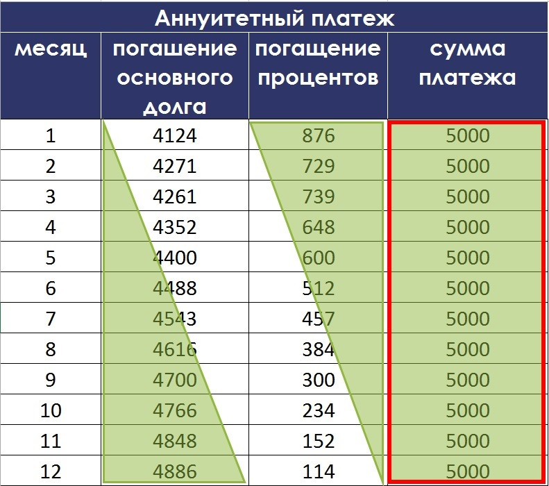 При аннуитете выплаты основной суммы и процентов распределяются по специальной формуле таким образом, что сумма ежемесячного платежа всегда одинакова. Поэтому платежи всегда будут осуществляться равными долями. К примеру, каждый месяц заемщик будет платить по 5 тыс. сомов. Это удобно для заемщиков с точки зрения равномерной нагрузки на семейный бюджет, так как им легче платить фиксированную сумму, чем каждый раз пересчитывать деньги, направляемые на погашение кредита.